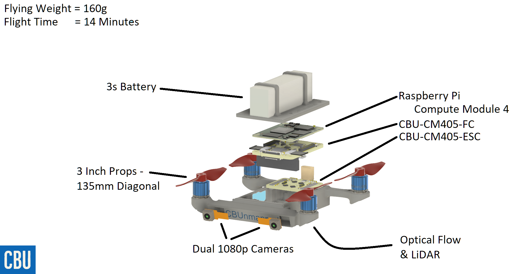 Designed to house x2 Pi Zero style Cameras, this frame builds a GPS-denied (indoor) drone perfect for exploring stereo imaging with a flying weight of just 160g and a flight time of 13 minutes.&#x20;