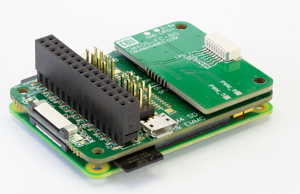 The full Raspberry Pi 40 pin GPIO is available through pads on the main board. Please note that there are some specific changes implemented that may cause issues with some hats. The UART is normally connected to the flight controller (if jumper fitted) and the I2C lines have been used for dual cameras. For more information see